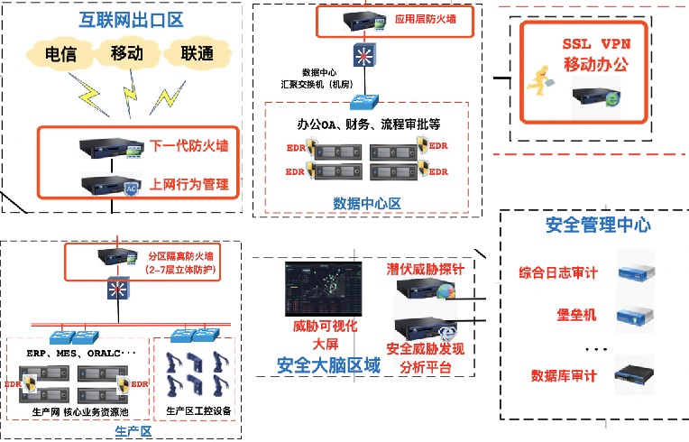 硬件設備:邊界下一代防火墻(出口邊界)、上網行為管理、分區防火墻、移動辦公安全