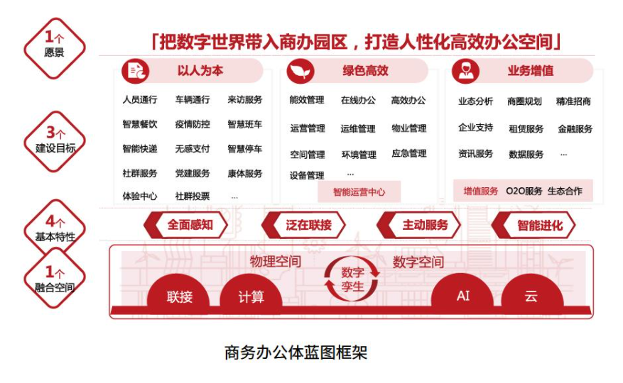 建設目標,則可以結合商辦特點,把如何以人為本、綠色高效、業(yè)務增值在商辦園區(qū)展開設計;同樣,全面感知、泛在聯(lián)接、主動服務和智能進化 4個基本特征,1個融合空間等內(nèi)容,作為支撐的基礎,可結合商辦園區(qū)的特點,在技術實現(xiàn)層面加以詳細規(guī)劃。