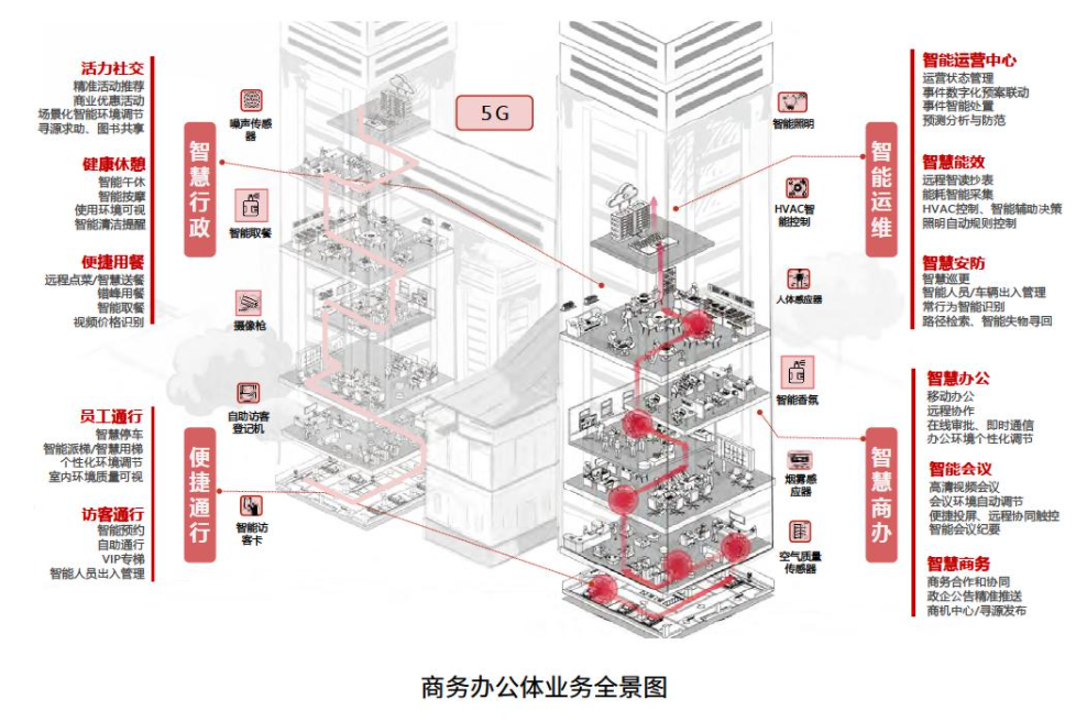 從用戶旅程的視角,圍繞以人為本、綠色高效和業(yè)務增值的目標,分別從便捷通行、智慧商辦、智慧行政和智慧運維幾個維度,勾勒商辦園區(qū)的智慧化場景和服務設計(如圖所示)。