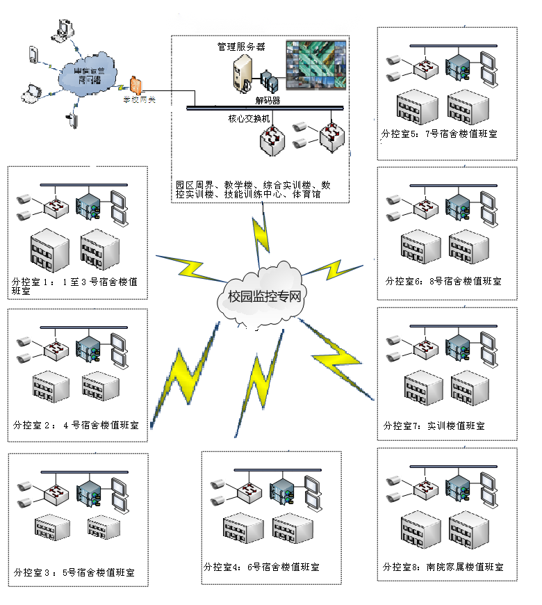 (1)分校區現有的監控點遍布學校各個重要點位,包括教學樓、一體化樓、實訓樓、辦公樓、學生宿舍、學生食堂、校內重要場所等。通過光纖鏈路將前端各個點位匯聚到監控中心,并統一傳到監控中心集中存儲。