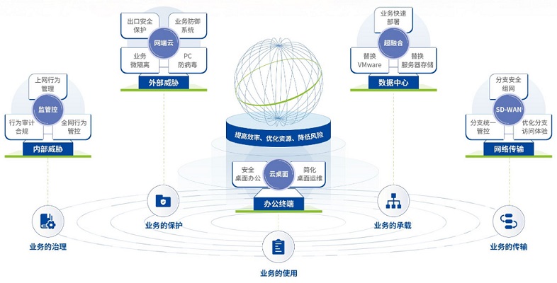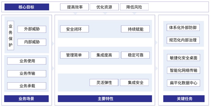 數(shù)字化轉(zhuǎn)型的核心目標是“提高效率、優(yōu)化資源、降低風險”,業(yè)務場景包含“業(yè)務保護、業(yè)務使用、業(yè)務傳輸、業(yè)務承載”,將核心目標與業(yè)務場景相結合,可明確數(shù)字化轉(zhuǎn)型關鍵任務為“體系化外部防御、規(guī)范化內(nèi)部治理、敏捷化安全桌面、智能化網(wǎng)絡傳輸、扁平化數(shù)據(jù)中心”。企業(yè)可進一步結合自身的發(fā)展情況,從最為緊迫的關鍵任務入手,一步步走好轉(zhuǎn)型之路。